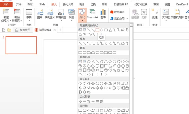 1、首先启动ppt2013,执行插入-形状命令,选择并插入一个细长矩形。