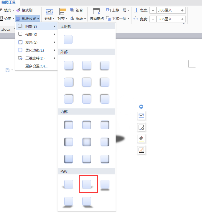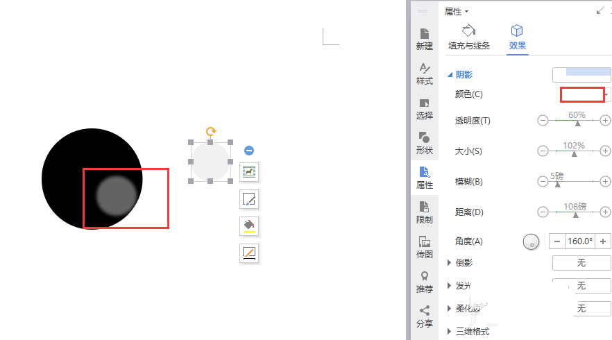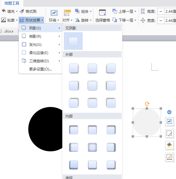2、接着复制这个圆,缩小一些,调整填充色为浅灰,接着选择形状效果-阴影,做出球的光面质感