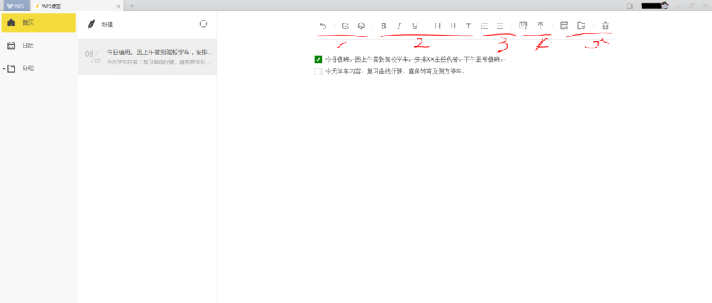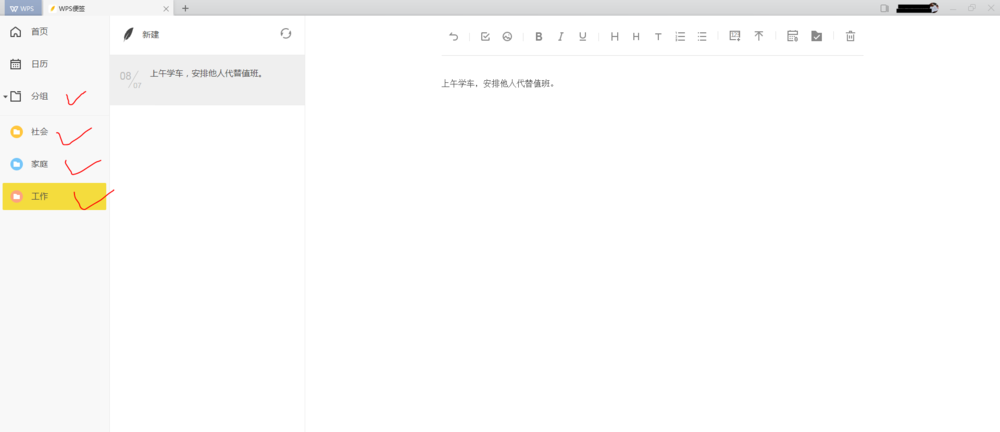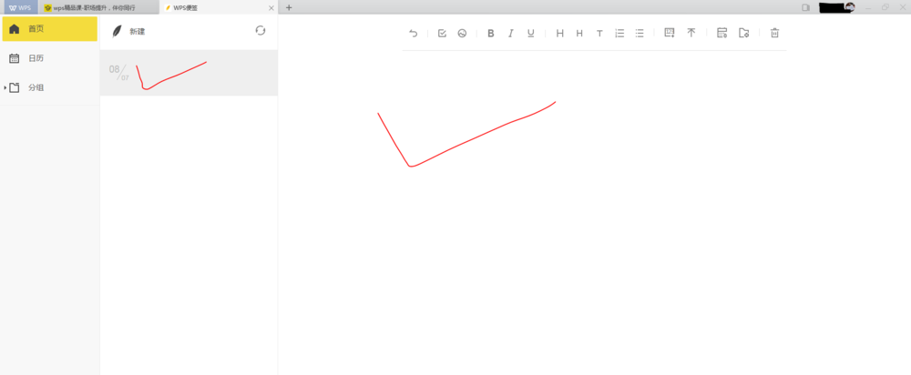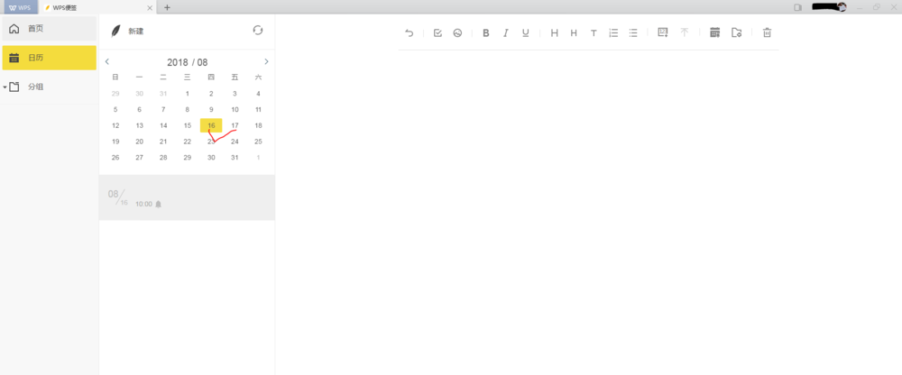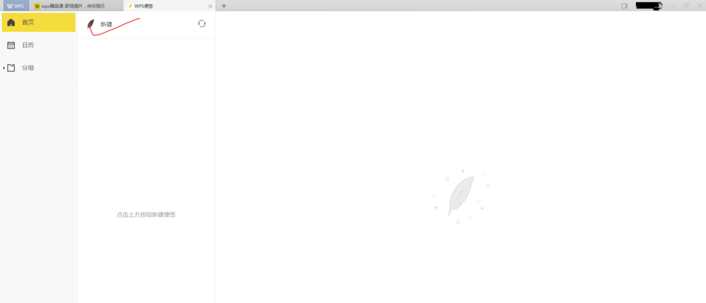2、点击“wps便签”,进入“便签”新建窗口。可看到非常简洁的窗口界面,左侧有首页、日历和分组几个分项,右侧是新建便签主窗口。