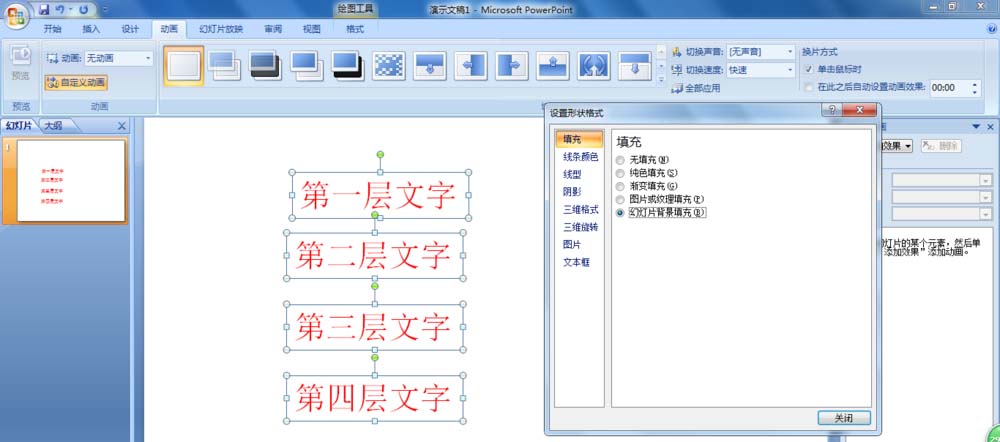 4、这时文本框是透明的,全选或框选这几个文本框右击,在弹出的快捷菜单中选择“设置形状格式”,在打开的“设置形状格式”对话框中选择“填充”、“幻灯片背景填充”,然后单击“关闭”。
