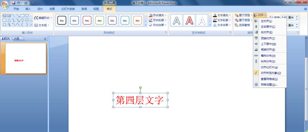 5、框选输入文字的几个文本框,单击“格式”选项卡,在“排列”组中单击“对齐”按钮,分别选择“左右居中”、“上下居中”,就对齐了所选文本框。