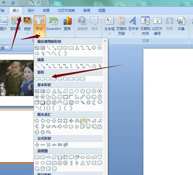1、打开ppt文档,新建一张空白幻灯片,然后点击菜单栏 插入 ,再点开形状里面,选择一个矩形