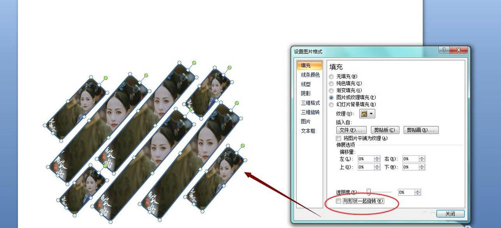 6、插入图片后,把设置对象格式里面的与形状一起旋转前面的勾去掉,然后图片就填充成功啦