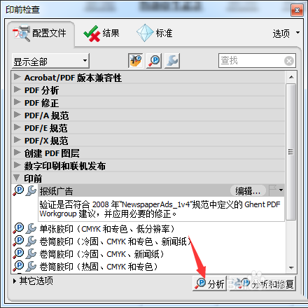 5、点击了印前检查的之后,弹出了的印前检查的窗口的当中,进行点击 分析 按钮。