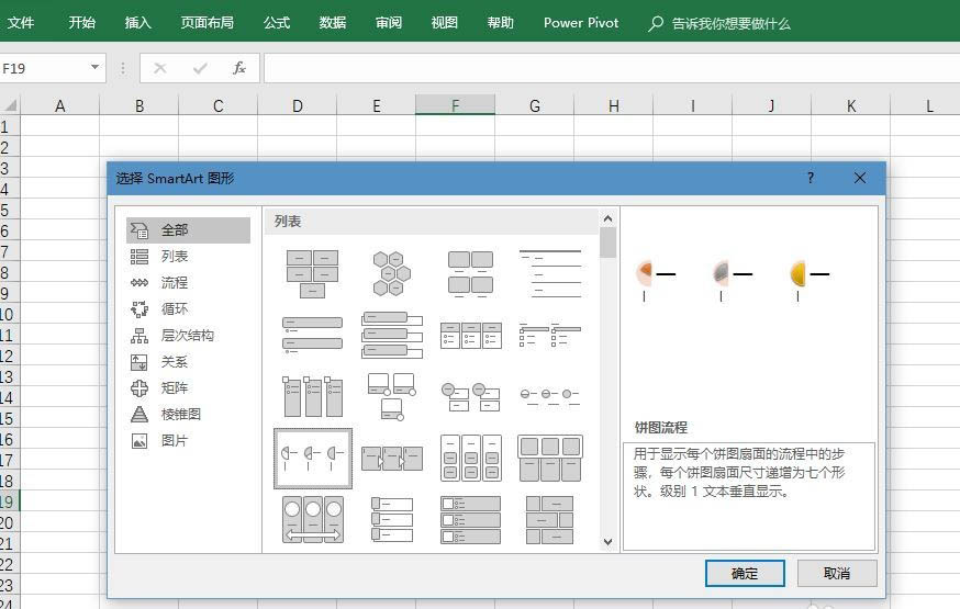 2、在弹出的SmartArt图形选择对话框中,选择右侧的“饼形流程”按钮,然后,点击“确认”按钮