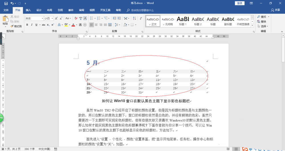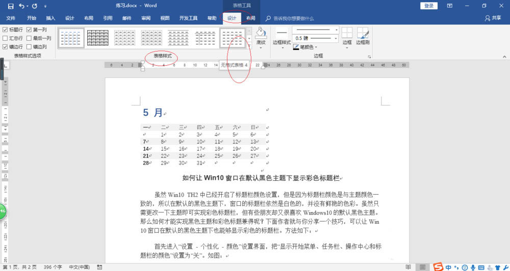 6、如图所示,完成利用表格内置样式插入日历的操作。本例到此结束,希望对大家能有所启发。