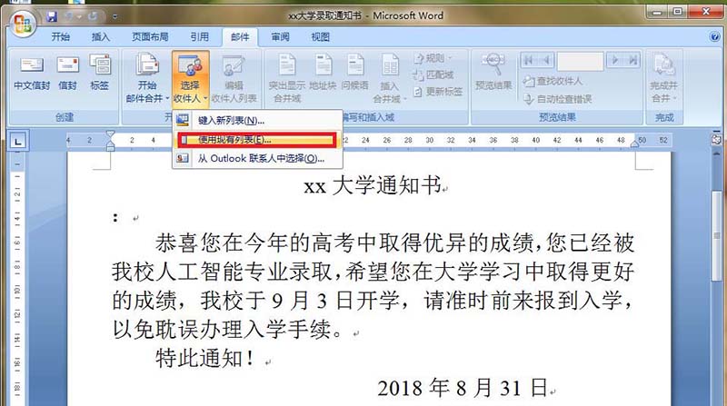 3、点击“选择收件人”右边的三角形,调出下拉菜单,选择“使用现有列表”