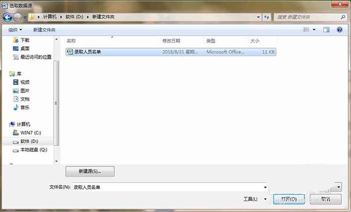 4、找到存有名单的的Excel表格,点击表格,然后点击“打开”