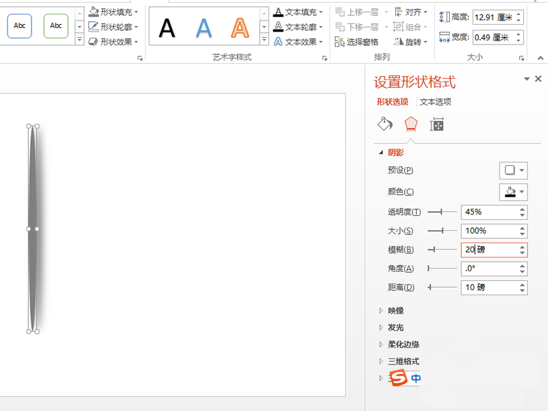 3、调出设置形状格式,选择阴影,预设设置为内部向右偏移,透明度为45,模糊为20,距离为10