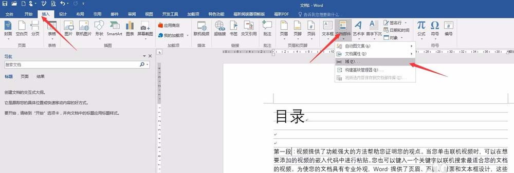 3、点击“插入”——“文档部件”中的“域”。