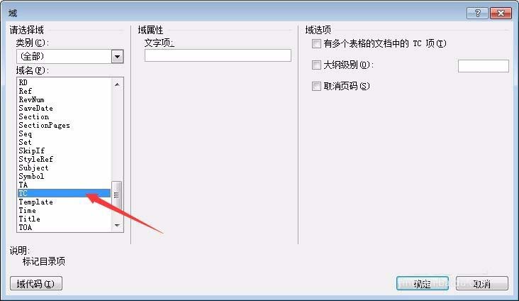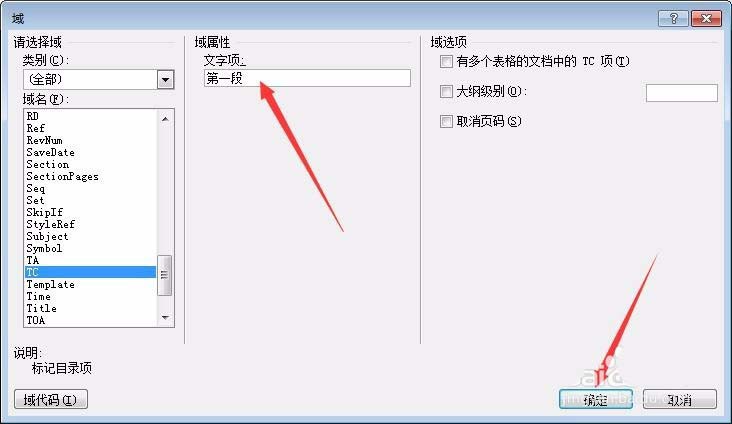 5、在TC域域属性文字项窗口中,在框中输入要成为目录的文字,点击确定。