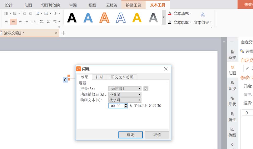 8、在效果选项卡中,将动画文本设为按字母,延迟填100,点击确定。如图。