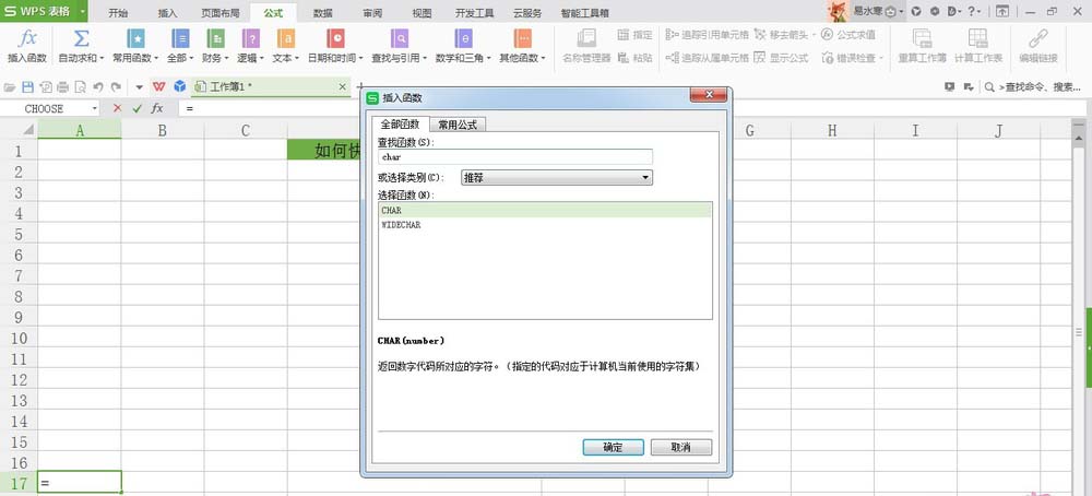 3、选择函数CHAR,该函数即为插入函数,用来插入指定的内容;