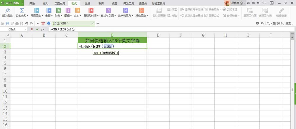 4、输入公式=CHAR(ROW(A65));
