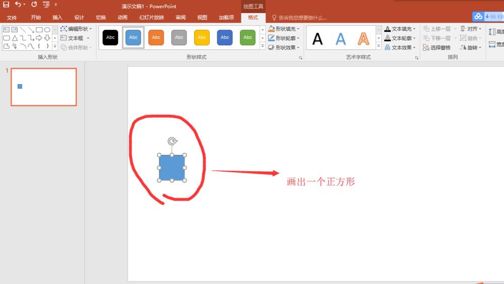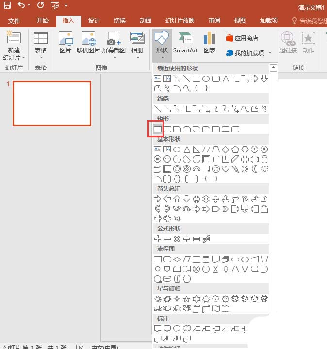 2、切换到插入菜单,在插入菜单下面找到形状命令,单击形状,在出现的众多内置形状中选择矩形,然后结合键盘上的辅助键shift+alt键,在幻灯片中插入一个正方形。