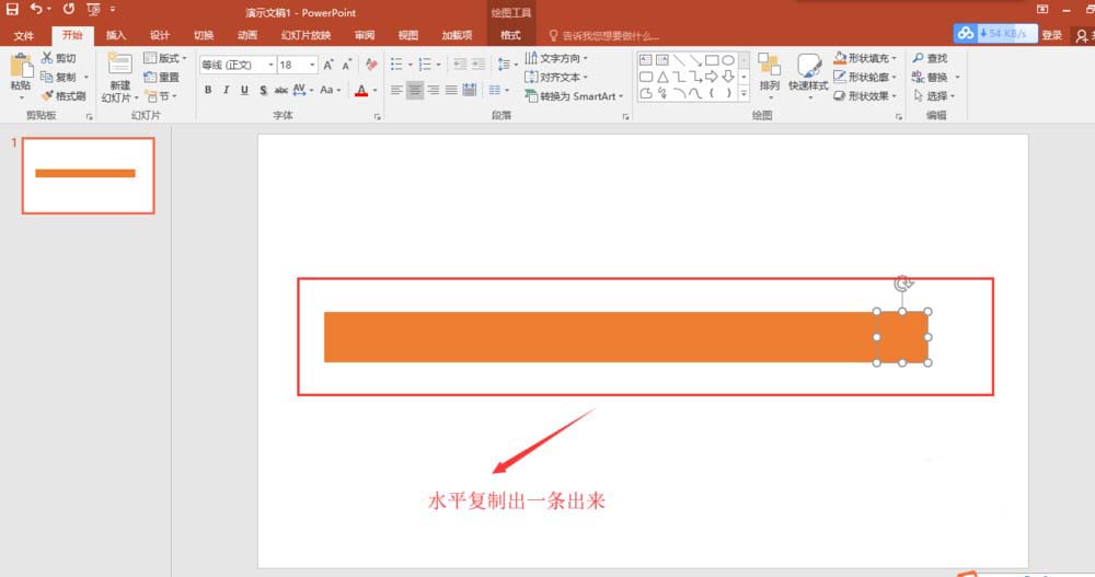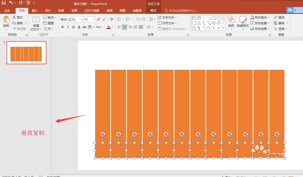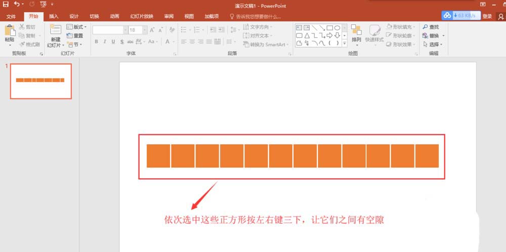 4、选中设置过格式后的正方形,按住键盘上的辅助键shift+Ctrl键,水平移动正方形,得到一个复制拷贝的正方形,重复操作,多次水平复制,最终得到了排成一排的一行正方形。