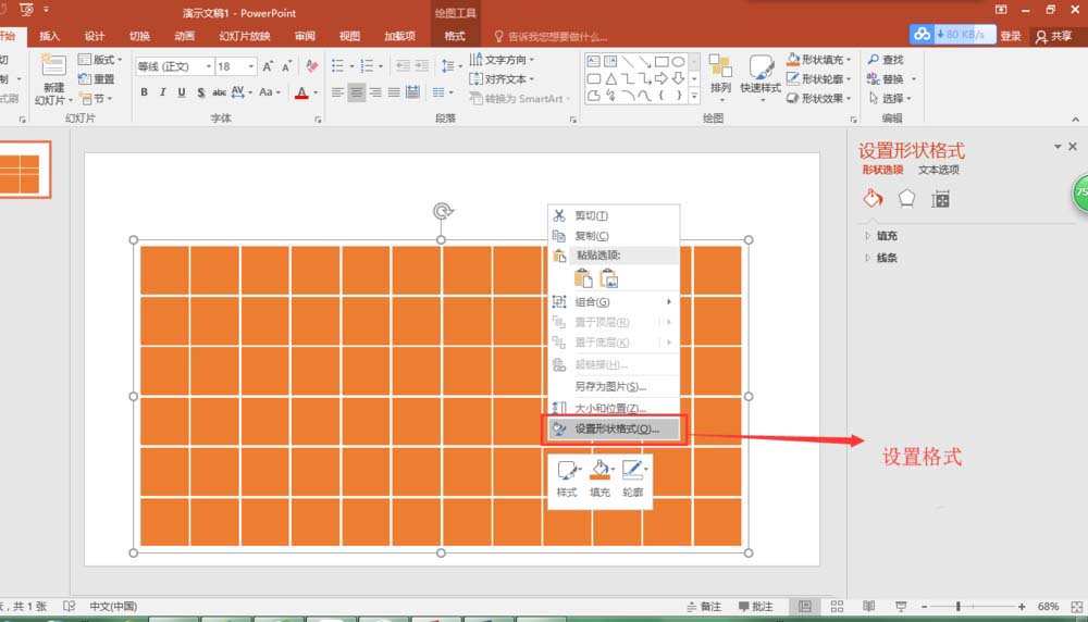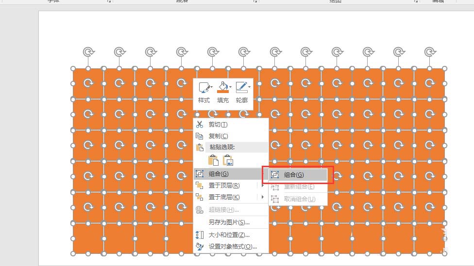 6、拖动鼠标框选中所有的正方形,右键鼠标选择组合,将所有的正方形组合到一起;在鼠标右键组合后的形状,选择设置形状格式。