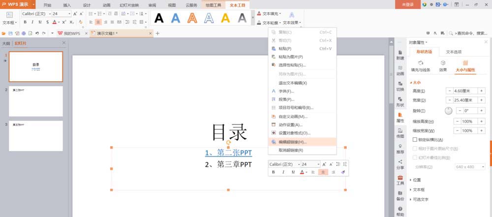 6、如果想更改目录目标位置,可以选中该目录文字然后右击,点击“编辑超链接”进行相应更改即可。