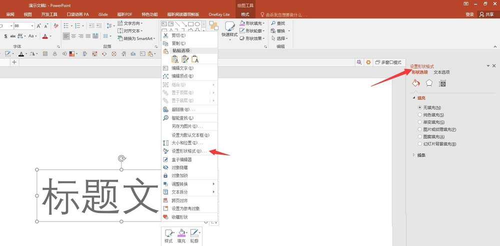2、右键单击文本,选择“设置形状格式”,右侧将打开格式设置窗口。