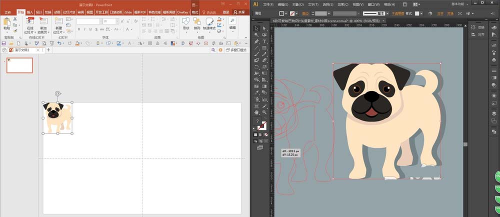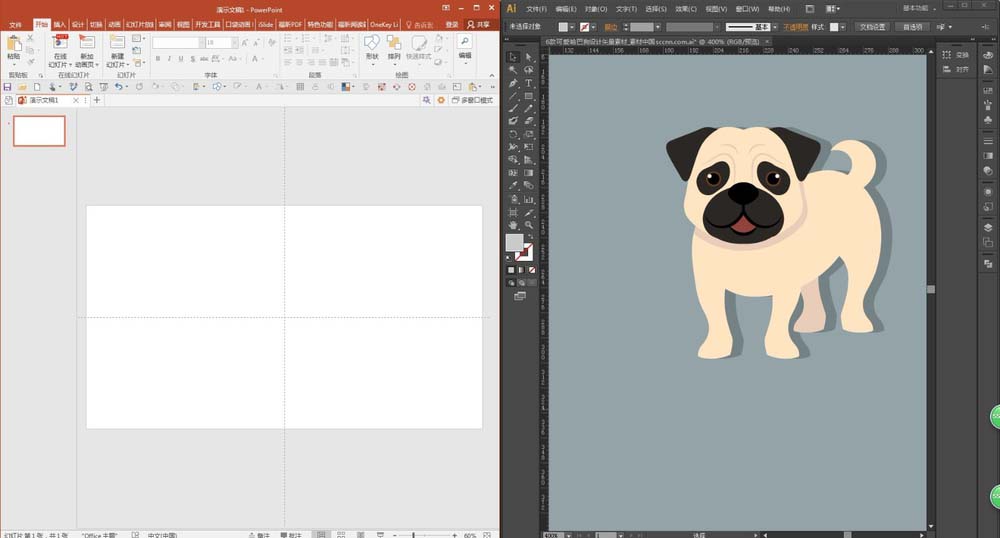 2、打开ppt文档,将Ai窗口和ppt窗口并排显示。