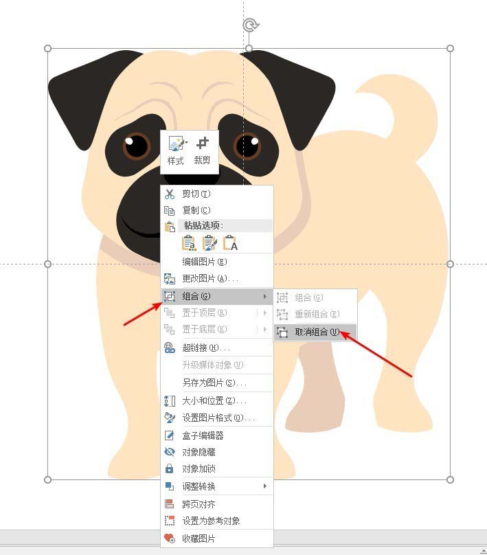 5、PPT中选中素材,点击鼠标右键,选择“组合”中的“取消组合”,连续两次取消组合。