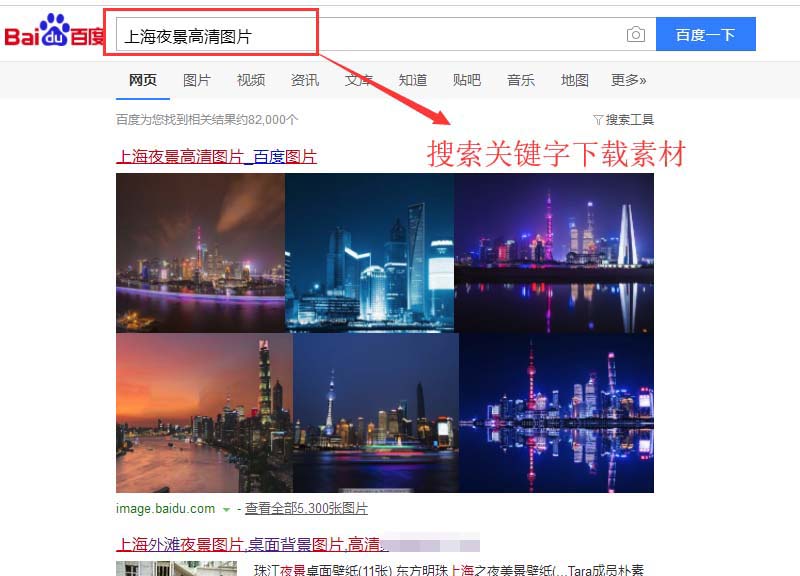 1、要制作城市夜景海报,首先要确定你选择的城市,并且要找到这个城市的夜景素材,我们以上海为例,在百度中搜索上海夜景高清图片,在出现的搜索结果中下载一个上海夜景的素材图片以作备用。