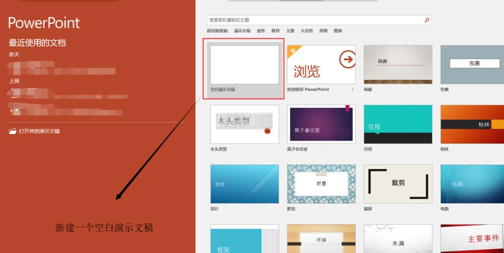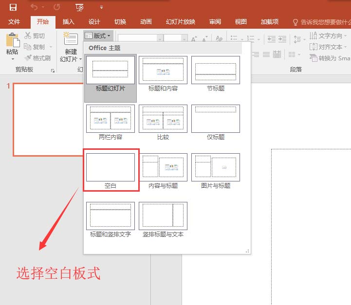 2、打开PPT 2016演示文稿软件,新建一个空白的演示文稿,将新建的演示文稿的板式设置为空白板式。