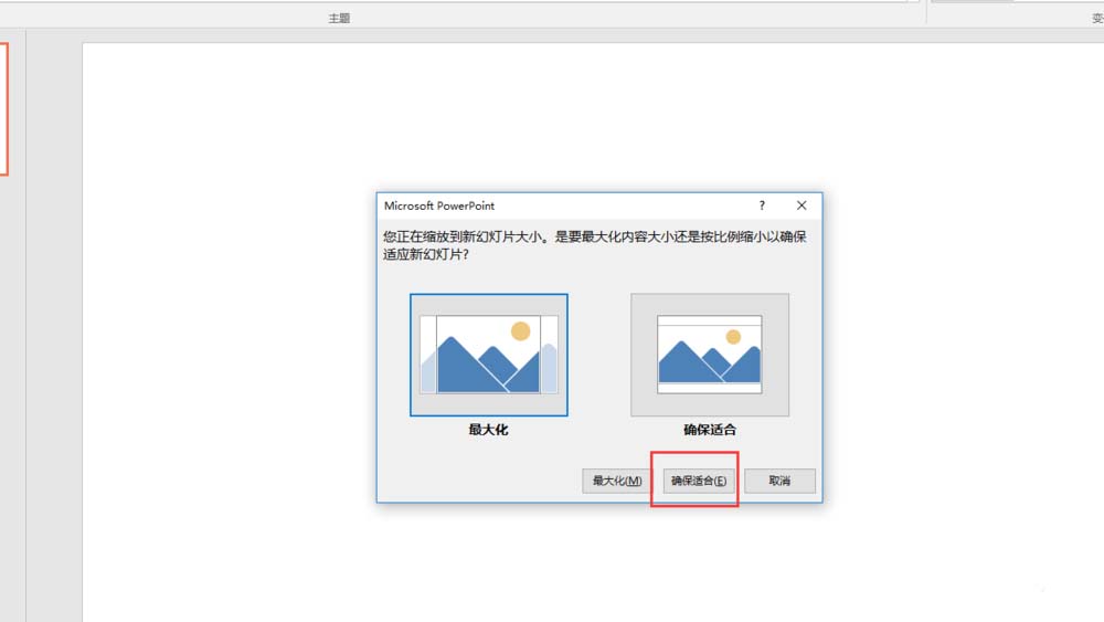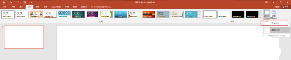 3、设置好演示文稿的板式之后,我们接下来要设置幻灯片页的大小,因为你不论在做什么海报之前,你肯定都需要先确定海报的大小,所以我们切换到“设计”菜单,找到幻灯片大小设置,选择标准4:3的大小设置,在弹出的窗口中选择确保合适。