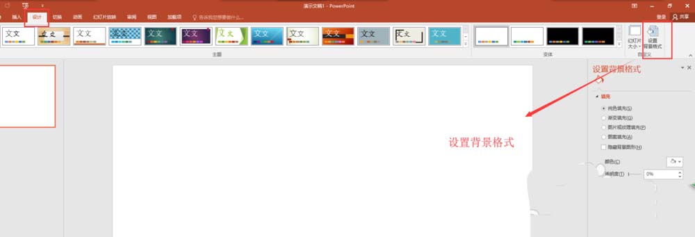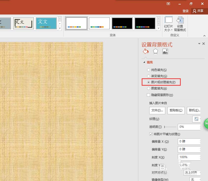 4、在设计菜单中找到设置背景格式命令,会在幻灯片的右侧弹出一个设置背景格式的窗口,在背景设置中选择图片或纹理填充,在图片与纹理填充的下方点击来自文件,在弹出的文件窗口中找到并选中我们之前找到下载的图片素材,点击插入进行导入。