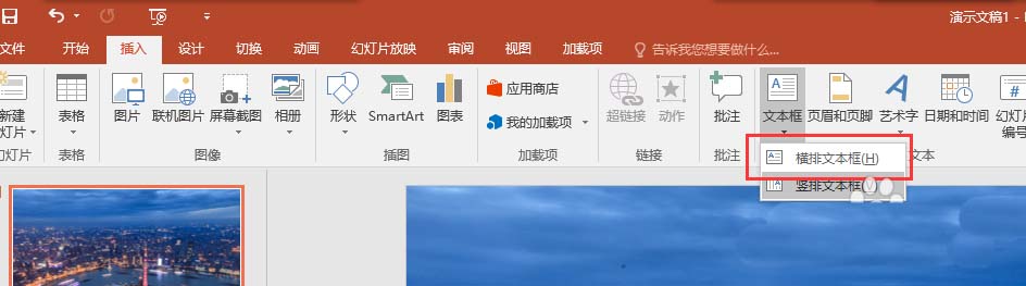 5、选择插入菜单中的文本框工具,在文本框中选择插入一个横排文本框,然后用鼠标左键在幻灯片页的中间画出一个文本框,在文本框中输入文本内容“上”。