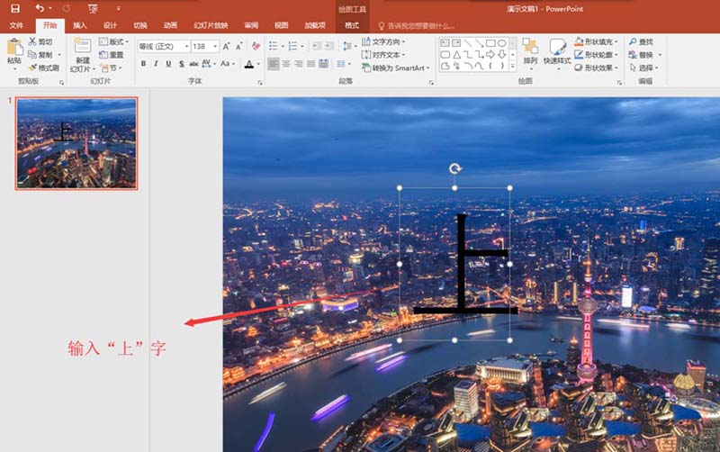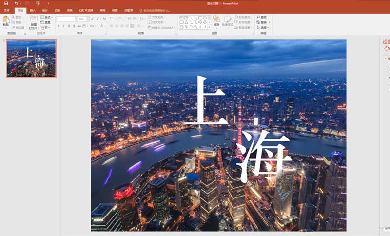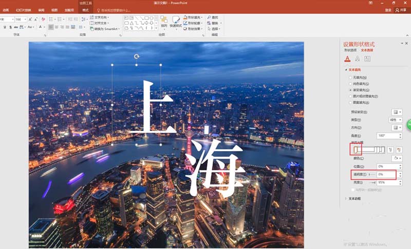8、同样的操作,也是选中“海”字,设置文本的渐变填充,给“海”字设置一个右下角的渐隐效果。至此,我们就通过PPT 2016制作了一个简单的城市夜景海报了。
