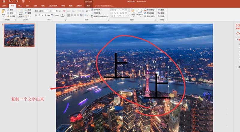 6、选中文本“上”,结合键盘上的Ctrl辅助键,拖动复制出一个文本出来,然后将复制出的文本内容改为“海”,然后分别将这两个文本内容进行选中,设置他们的字号,字体,颜色等属性。