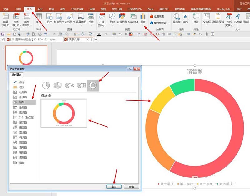1、在ppt文档中插入图表,图表类型选择饼图下的圆环图。