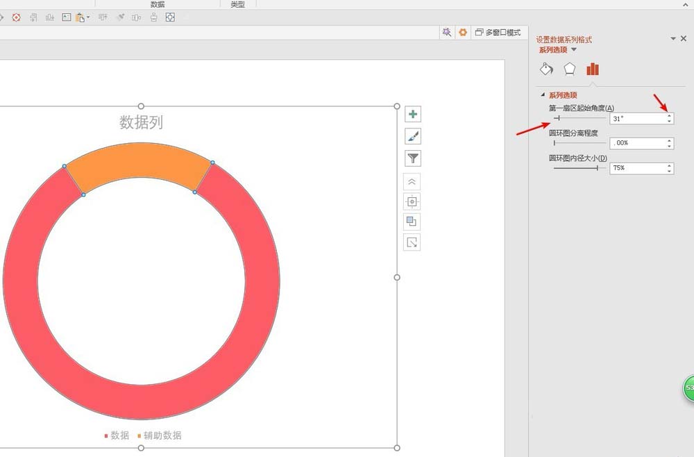 4、双击圆环,右侧弹开格式设置窗口,在“第一扇区起始角度”中拖动滑块或点击箭头,改变扇区角度,使辅助数据列圆环垂直居中。