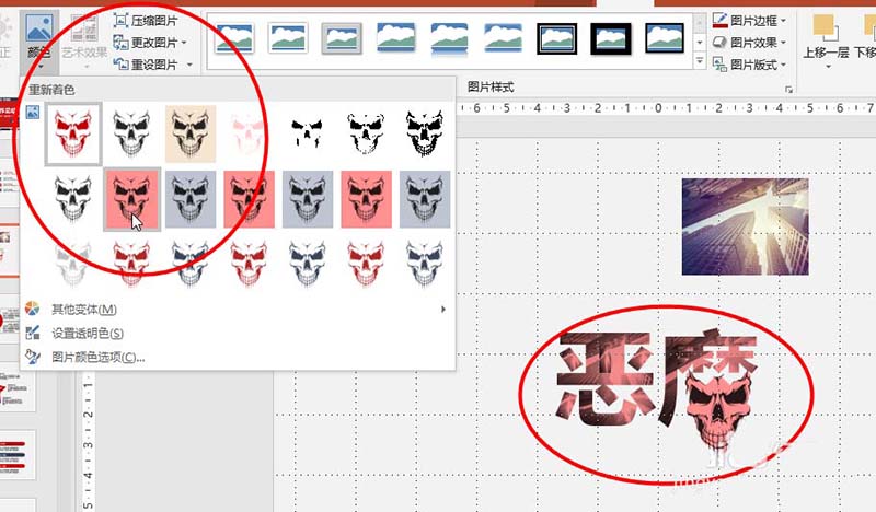 6、然后再将要合并的图片调整大小,拖动到相应的位置,然后点击“格式-颜色”,调整整体的颜色即可