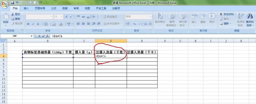3、然后我们在D4单元格输入公式=B4*C4,这样只要在B4、C4输入相应的量,就能够计算摄入食物的总热量千焦。
