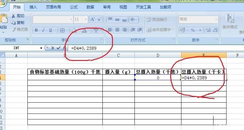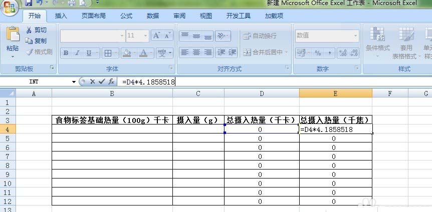4、1千焦kJ=0.2389千卡kcal,所以在E4单元格输入=D4*0.2389