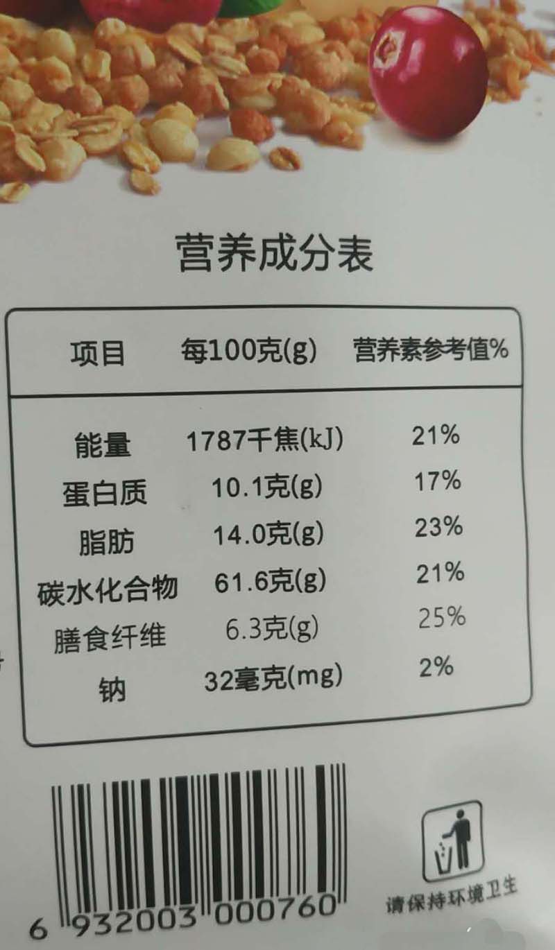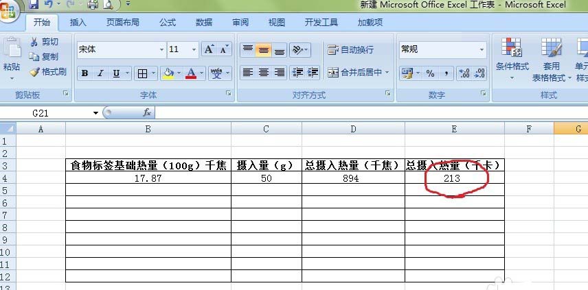 5、公式完成后就可以开始计算了,比如这款麦片的热量是每100克1787千焦,摄入了50克,就可以计算出输入的总热量是213千卡