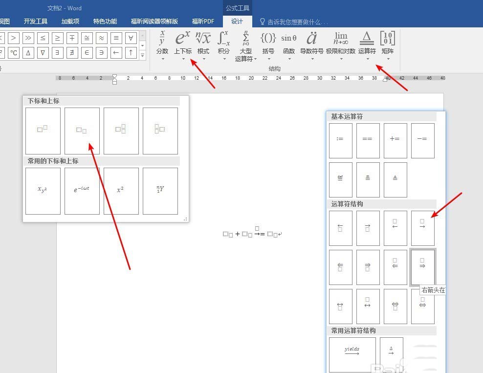 3、以氢气和氧气燃烧的化学方程式为例,先分别点击“上下标”、“运算符”等,把方程式的框架列出。