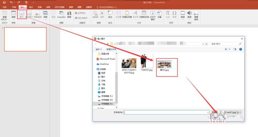 2、切换到菜单中的插入菜单,在插入菜单中找到插入图片命令,在弹出的“插入图片”窗口中,找到我们要作为照片墙展示的图片,选中该图片,然后点击插入将该图片插入到幻灯片页中。