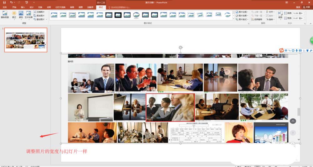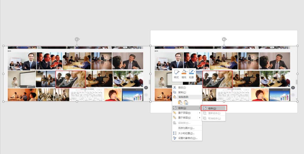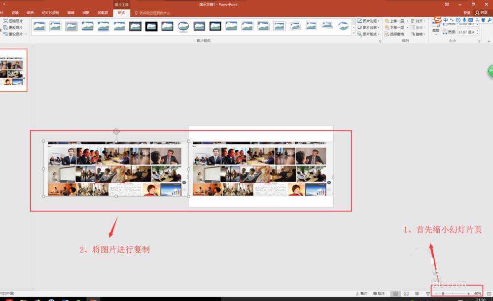 3、选中插入到幻灯片页中的图片素材,调整其宽度和高度,高度适中即可,宽度要与幻灯片页的宽度对齐;然后缩小幻灯片页显示,按住Ctrl和shift键在水平复制出一个图片出来;选中这两个图片素材右键鼠标将其组合到一起。