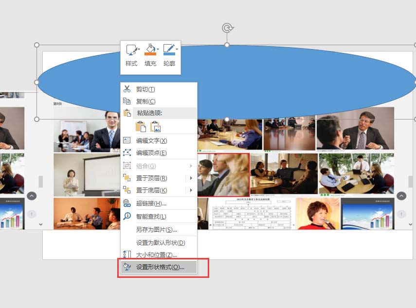 4、然后选择插入菜单中的形状命令,在形状中找到椭圆形状,然后在幻灯片页上绘制出一个大小比幻灯片稍微大一点的椭圆出来;选中该椭圆,右键鼠标选择设置形状格式命令。