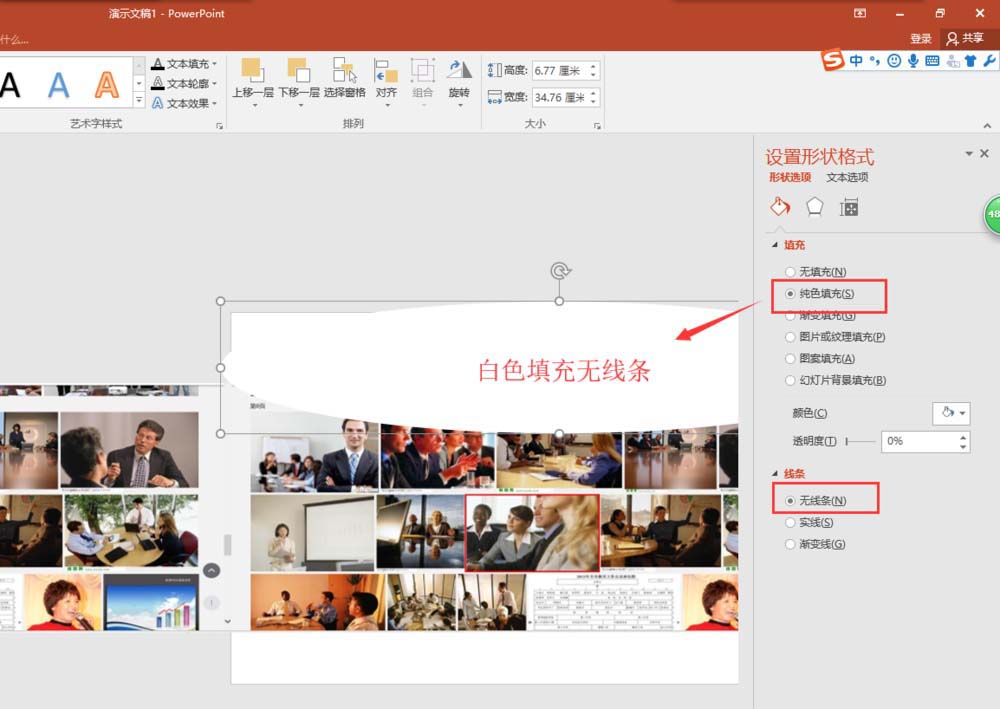 5、点击设置形状格式命令之后,会在PPT 2016界面的右侧出现一个设置形状格式的窗口,然后设置该椭圆的填充为纯色填充,颜色设置为白色;线条选择为无线条。