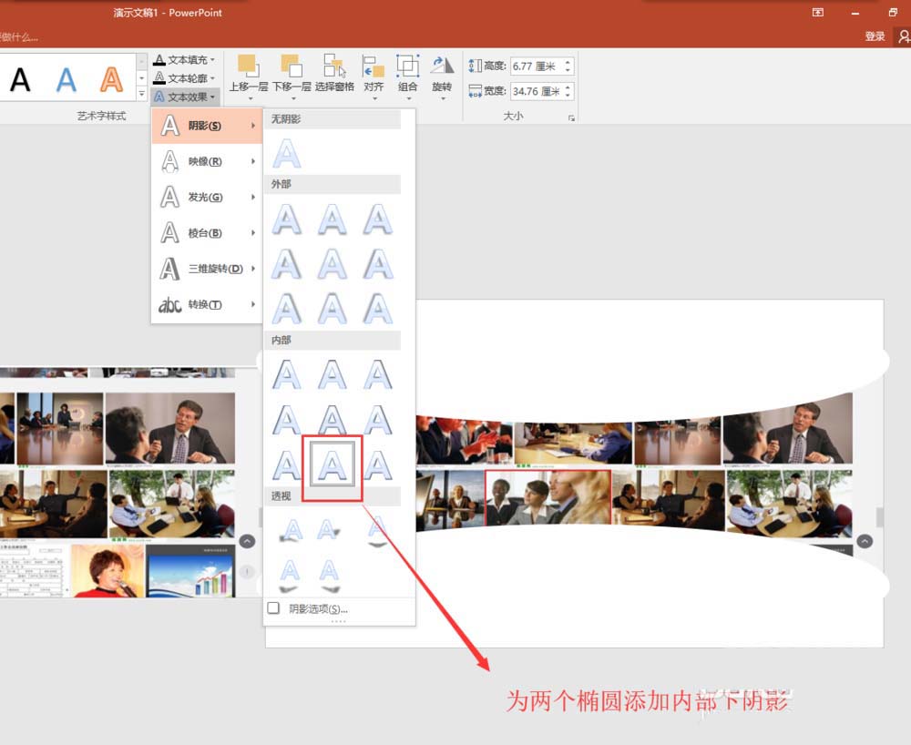 7、选中两个椭圆,为其添加一个内部下阴影的效果;然后在幻灯片的上下空白位置输入你要输入的文字;在选中组合后的图片,为组合后的图片添加一个向右出现的动画效果,按F5播放演示文稿,一个巧用椭圆工具做立体照片墙的动画就完成了。