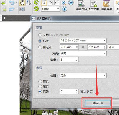 3、进入插入空白页界面之后,首先需要选择插入页面的格式,然后点击“页码”选项,选择需要插入的位置,最后点击“确定”按钮,即可成功将新的文档页面插入PDF文件当中,如下图所示: