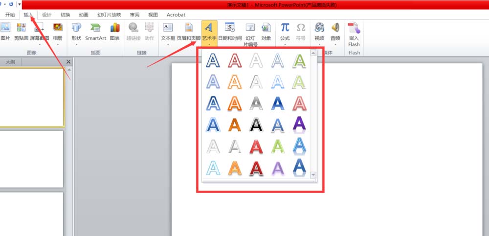 2、接着我们点击上方的插入,可以看到形状,图表等。我们点击上方的艺术字,就可以看到插入艺术字的候选栏。如下图所示。