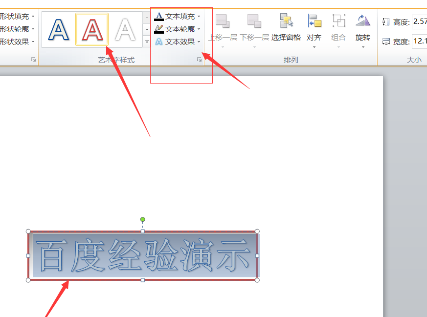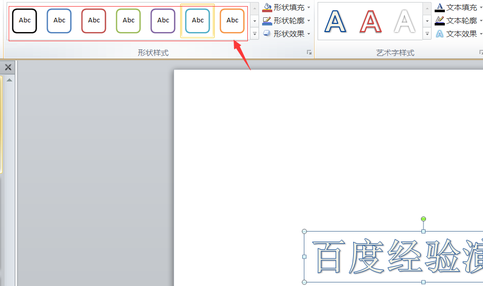3、我们插入一个艺术字之后,然后双击一个艺术字,就可以出现上面的候选栏,有形状样式,形状填充,形状轮廓,形状效果等。如下图所示。