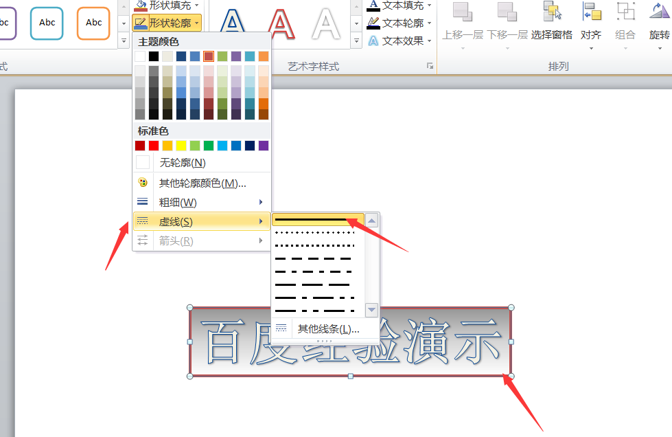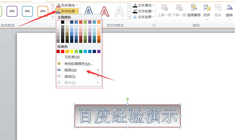 5、再接着我们设置形状轮廓,形状轮廓一般是指整个轮廓的颜色,也可以调整个轮廓的粗细和线条样式,如下图所示。