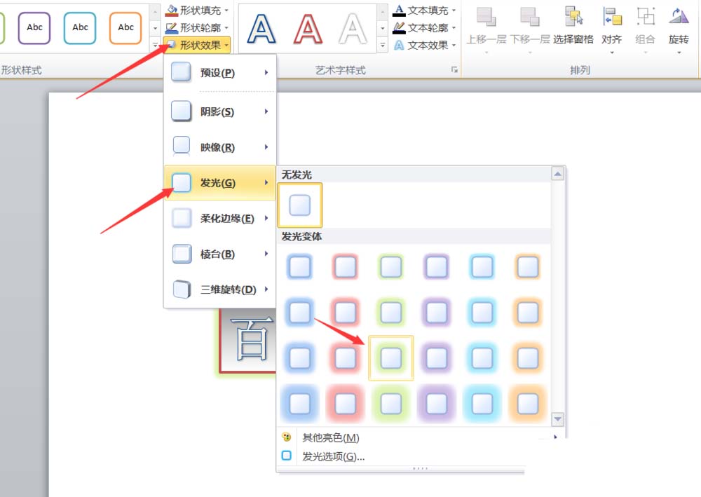 6、再接着我们可以设置整个艺术字的形状效果,形状效果可以设置为阴影,印象,发光等各种各样的样式,大家以自己的喜好进行设置。如下图所示。