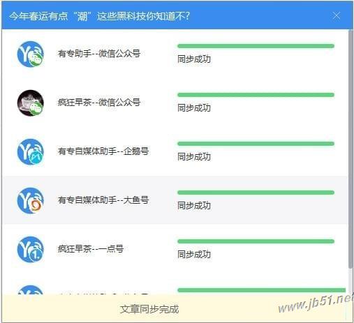 弹框会显示文章同步或发布的进度和结果,如下图所示: